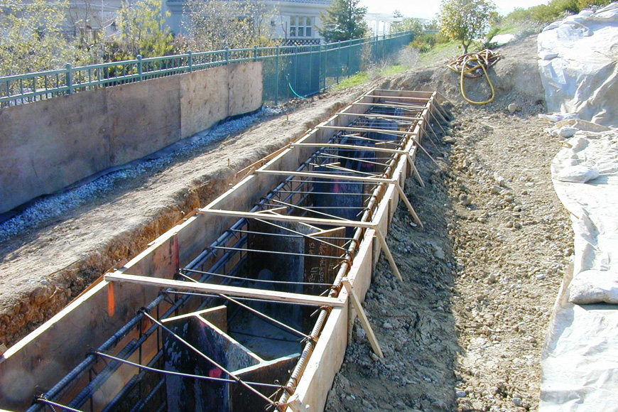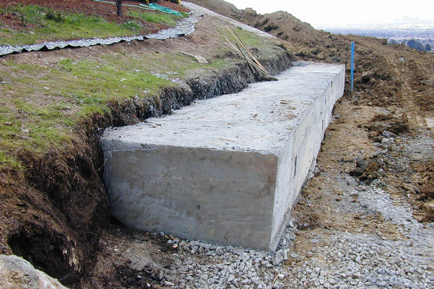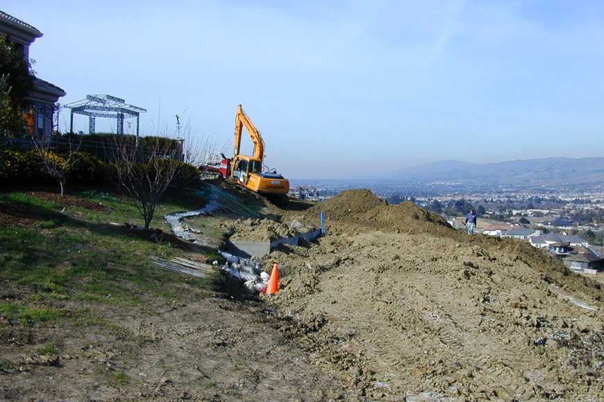 With hillside now secured, begin grading work to dress the top of the Bond beams. February 2001.