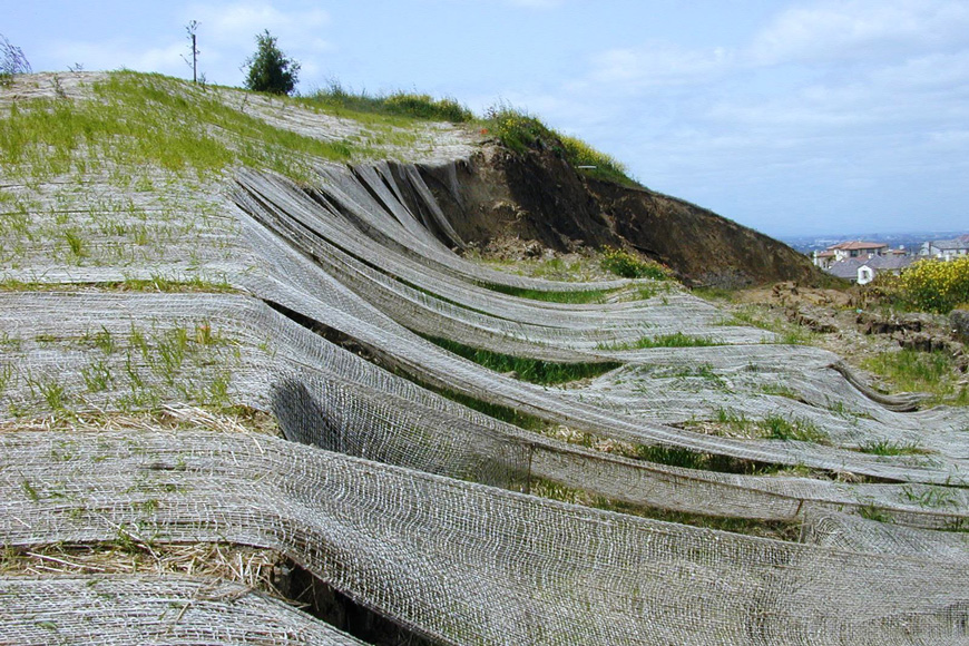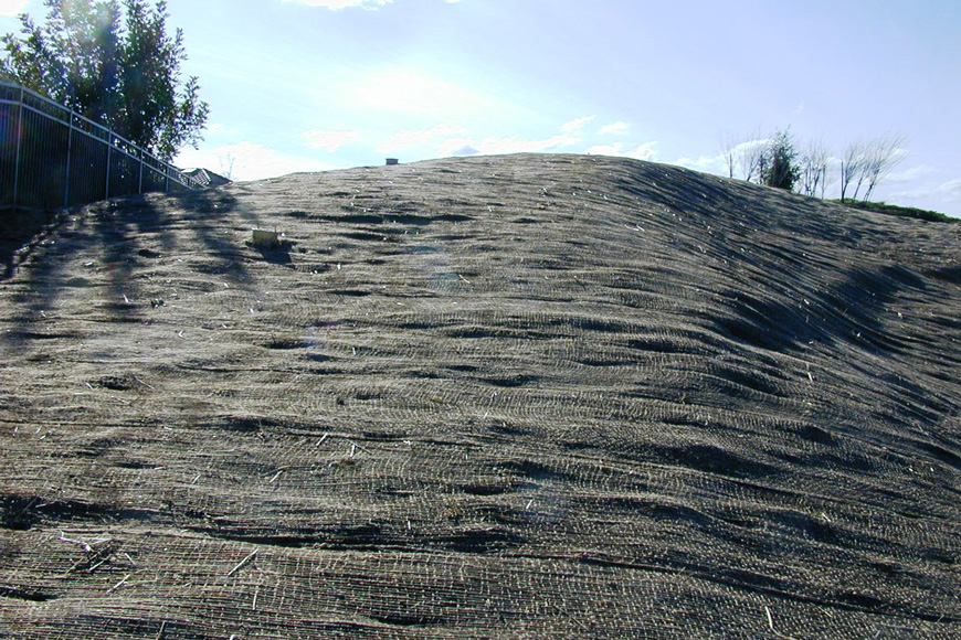 Finish grading around bond beams is completed and covered with protective jutt netting. February 2001.