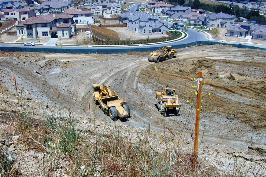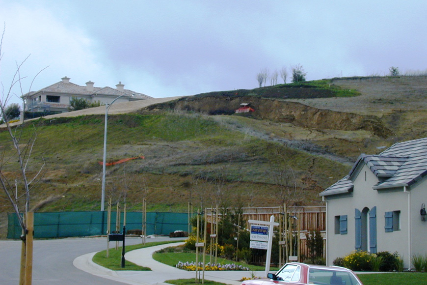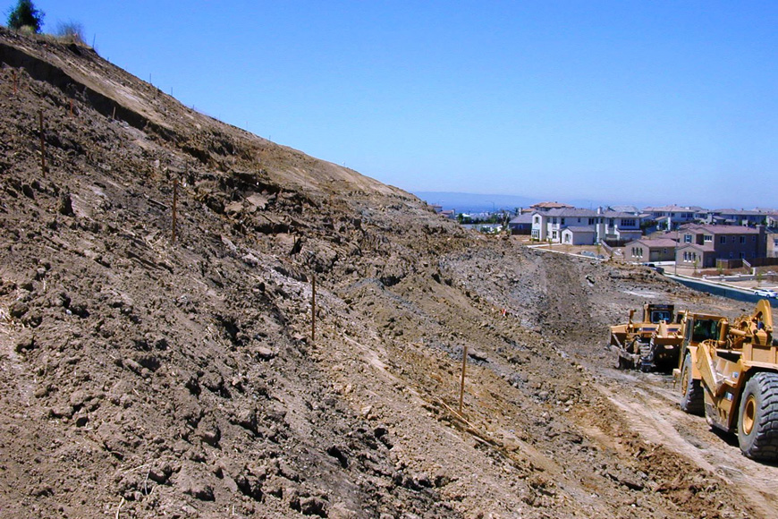 Grading begins. Removal and recompaction of loose landslide materials. May 2001.